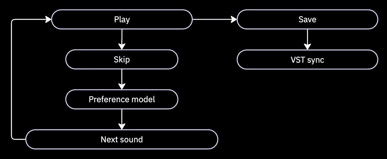 All discovery actions feed a shared preference model stored in the cloud. When a sound is saved on any device, it becomes immediately available inside the LoopHaven VST plugin, removing the need for manual downloads, file management, or importing workflows.